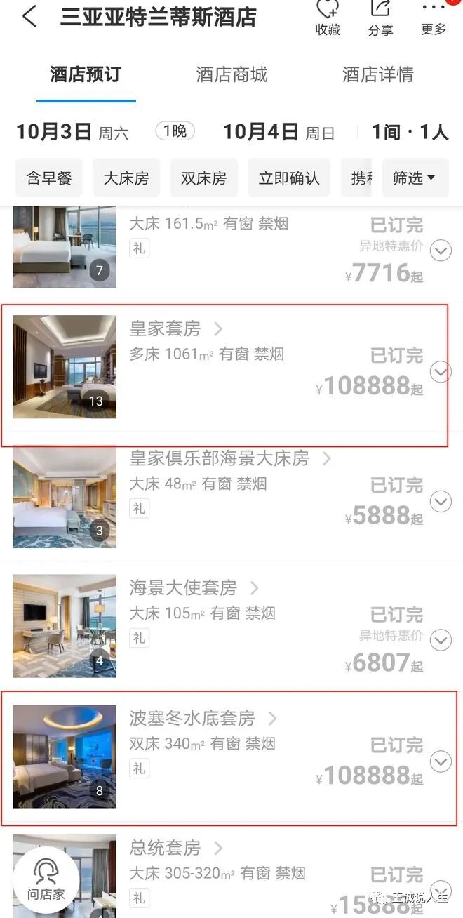 旅游旺季的报复性消费在这个国庆长假展露无遗,著名的网红酒店三亚亚特兰蒂斯酒店,皇家套房和波赛冬水底套房均被炒到了108888,仍然被抢购一空,贫穷限制了我的想象!我反复看了又看,还以为多数了一个数字,最后才发现,唉,后悔五一没去三亚玩了,那会儿好像机票只要一百多(国庆长假炒到一万多),房钱只要一千多,妥妥地去一趟就相当于赚了几十万啊!可惜世上没有后悔药。