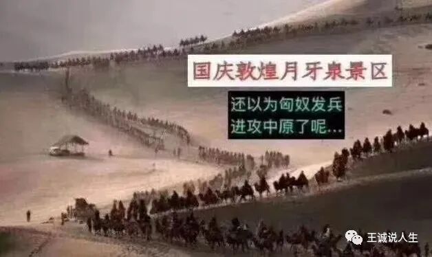 要说北京上海重庆这样的大城市人满为患也就罢了,毕竟那是人气标杆,中国人就喜欢哪里热闹就往哪里凑。可是这个国庆节就连大漠深处的敦煌月牙泉景区,也是车水马龙,人潮川流不息,有逗逼的网友制作了这面这张图,配上了挺幽默的一句话:还以为匈奴发兵进攻中原了呢!