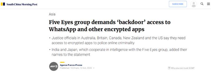 根据《南华早报》援引法新社报道:“五眼联盟”要求获得WhatsApp等加密应用的“后门”访问权限,这也就是说,美国科技公司的App相对于美国政府来说可能将不再有秘密。当地时间10月11日,“五眼联盟”五国的最高司法官员发表声明,宣称像Signal、Telegram、Facebook Messenger和WhatsApp这样拥有“端到端加密”技术的应用,使得官方监管变得不可能,并“对公共安全构成了重大挑战”。他们一致认为必须采取行动,为此“五眼联盟”呼吁科技公司“将公众安全纳入系统设计中”,以“可读和可用的格式”为执法部门提供访问渠道。不但“五眼联盟”发表了声明,日本和印度也加入了这一声明。