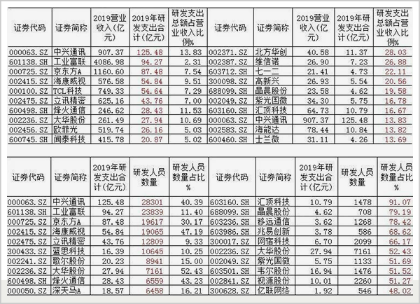 如果日韩的塑料友谊一直保持,三星能继续从日本上游厂家手中独家拿货,对于实施赶超战略的中国厂家来说,或许还真是个灾难。但2019年7月4日,特殊的地缘政治让日本宣布:对韩国出口关键技术的材料施加限制,日韩这对矛盾重重的老朋友,也走向了贸易战争的新台面。据外媒报道,面对三星在全球屏幕和半导体市场的绝对强势,日本早有不满。这种对抗,对于想要取代韩国优势地位的中国厂家来说,或许是一个弯道超车的好机会。事实上,面对LCD市场的严重过剩,国内显示面板厂家早在2015年就开始发力OLED。以京东方为例,这家中国的显示面板企业,2019年研发投入高达87亿,在国内通信电子行业中排名第三;其研发人员近2万人,同样位列第三。▲上表:研发支出排名、下表:研发人员数量排名