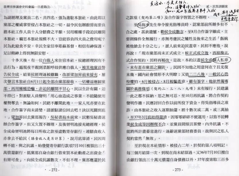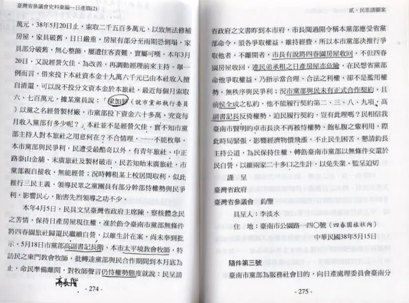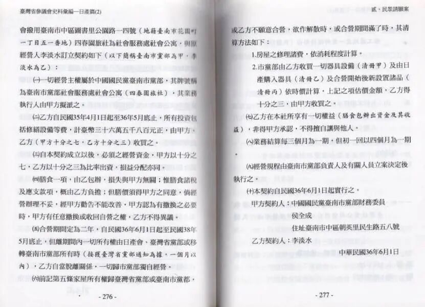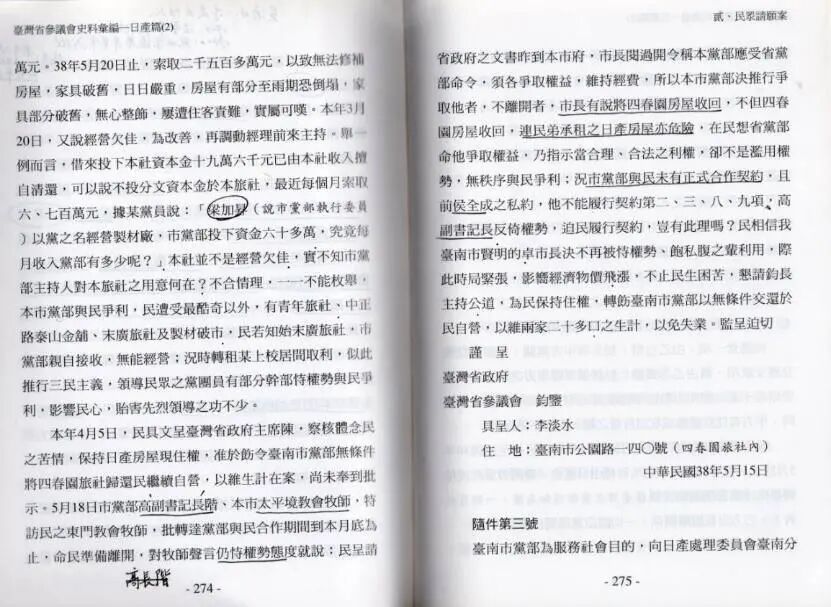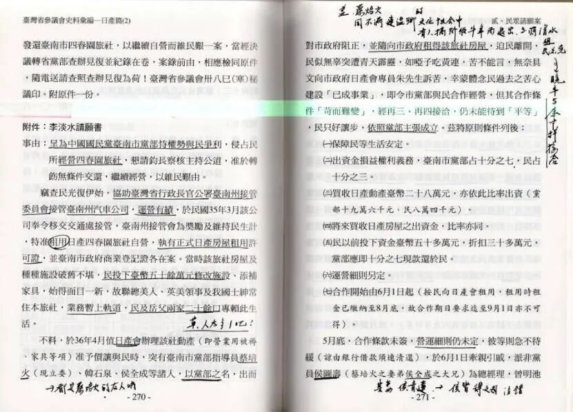 再说到关于接受团队贪腐者,其实不能否认的是,有相当一部分的台人利用这一机会与国府勾结而发达者,比如笔者便在《台湾省参议会史料汇编》里头发现一件很有意思的案子。此事是台南人李淡水因帮助接收委员会接管、运营台南州汽车公司而准其租用日产四季园旅社自营,手续完善且自备五十万台币重新整修,但是受到国民党台南市党部的觊觎,市党部不断以威逼利诱企图将该旅社纳入党产(按签订合同时党部代表不盖党部戳章,而是使用个人印章,李氏怀疑系因其欲私自侵吞),无奈之下向省参议会陈情,参议会亦要求市党部停止强征,但后续如何无从得知。