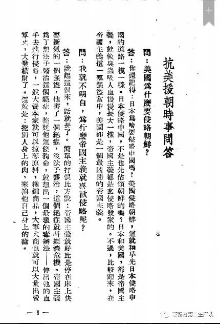 1951年出版的这本《抗美援朝时事问答》,用对话回答民众的“疑问”,特点是语言平易近人,比喻通俗易懂,容易让人接受。图源:革新村第二生产队