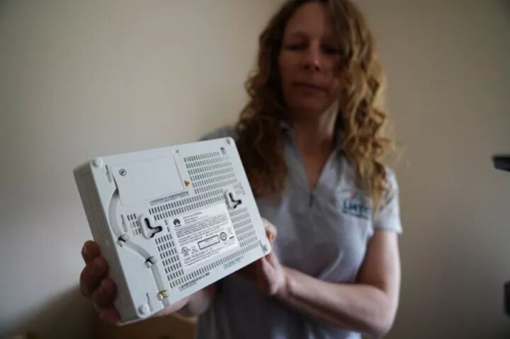 LHTC公司在当地的技术总监博妮·邦德展示一款华为通信设备。新华社记者刘杰摄