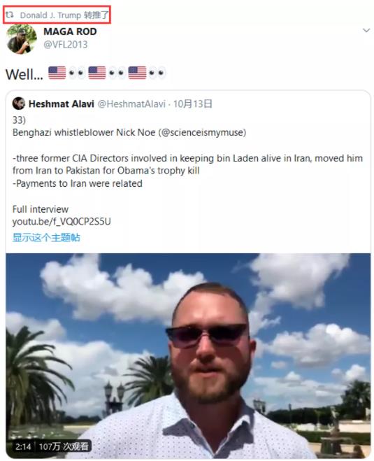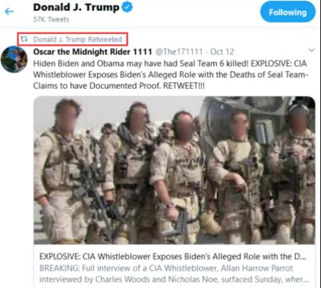 10月13日的时候,特朗普转了两条推特,大意是说:本·拉登没死,当年被美国击毙的,只是他的一个替身,真身逃到了伊朗,奥巴马、希拉里和拜登合谋,杀害了第六海豹突击队员灭口。