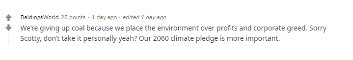 网友BaldingsWorld则拿出国家“气候承诺”:“放弃煤炭是因为我们要把环境置于利益和公司贪婪之上,抱歉斯科特,看待问题不过于个人化可以吗?我们的2060气候承诺更为重要。”