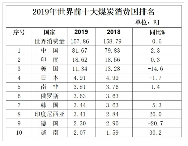 2019年,中国煤炭消费量占全球总消费量的51.7%,是当之无愧的世界第一煤炭消费大国。