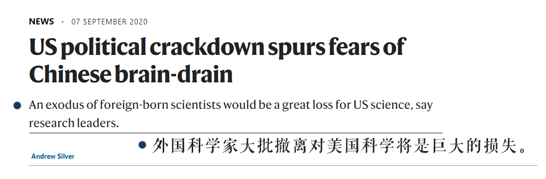 今年6月、7月、9月,在国际科学领域举足轻重的学术期刊《自然》连发多篇文章,都是表达对美国行为的担忧,甚至直言“外国科学家大批撤离对美国科学将是巨大的损失”。