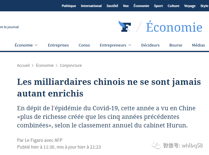 21日《费加罗报》发表了一篇题为“中国亿万富豪从未变得如此富有”的文章。