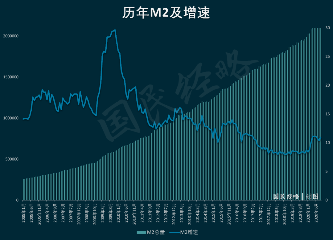 至于更受关注的广义货币总量(M2),则从10.4万亿升至200万亿,接近20倍。