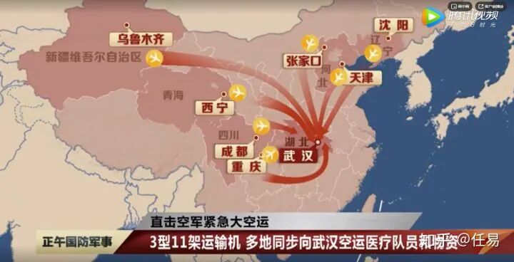 2月13日,6架运20和5架伊尔76、运9共11架运输机,从两个军用机场起飞,凌晨3点前后,分别飞抵8个民用机场,来自解放军的医护人员早已整装列队完毕。