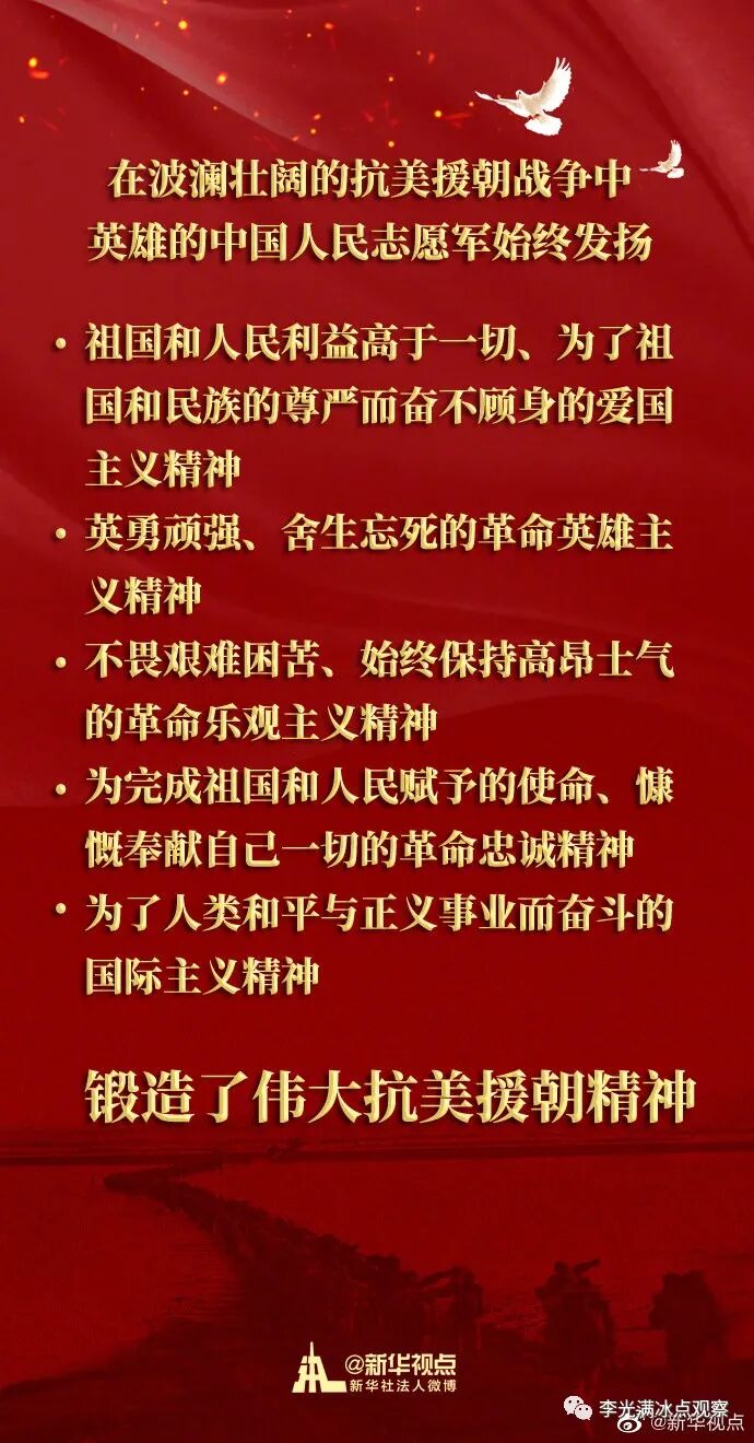 10月23日,习近平在纪念中国人民志愿军抗美援朝出国作战70周年大会上的讲话中有许多充满力量感、振奋国人精神的金句,现摘录如下:伟大的抗美援朝战争,抵御了帝国主义侵略扩张,捍卫了新中国安全,保卫了中国人民和平生活,稳定了朝鲜半岛局势,维护了亚洲和世界和平。抗美援朝战争伟大胜利,将永远铭刻在中华民族的史册上!永远铭刻在人类和平、发展、进步的史册上!19万7千多名英雄儿女为了祖国、为了人民、为了和平献出了宝贵生命。烈士们的功绩彪炳千秋,烈士们的英名万古流芳!在这样极不对称、极为艰难的情况下,中国人民志愿军同朝鲜军民密切配合,首战两水洞、激战云山城、会战清川江、鏖战长津湖等,连续进行5次战役,此后又构筑起铜墙铁壁般的纵深防御阵地,实施多次进攻战役,粉碎“绞杀战”、抵御“细菌战”、血战上甘岭,创造了威武雄壮的战争伟业。全国各族人民由衷称赞志愿军将士为“最可爱的人”!经过艰苦卓绝的战斗,最终用伟大胜利向世界宣告“西方侵略者几百年来只要在东方一个海岸上架起几尊大炮就可霸占一个国家的时代是一去不复返了”!抗美援朝战争伟大胜利,是中国人民站起来后屹立于世界东方的宣言书,是中华民族走向伟大复兴的重要里程碑,对中国和世界都有着重大而深远的意义。经此一战,中国人民粉碎了侵略者陈兵国门、进而将新中国扼杀在摇篮之中的图谋,可谓“打得一拳开,免得百拳来”,帝国主义再也不敢作出武力进犯新中国的尝试,新中国真正站稳了脚跟。这一战,拼来了山河无恙、家国安宁,充分展示了中国人民不畏强暴的钢铁意志!经此一战,中国人民彻底扫除了近代以来任人宰割、仰人鼻息的百年耻辱,彻底扔掉了“东亚病夫”的帽子,中国人民真正扬眉吐气了。这一战,打出了中国人民的精气神,充分展示了中国人民万众一心的顽强品格!经此一战,中国人民打败了侵略者,震动了全世界,奠定了新中国在亚洲和国际事务中的重要地位,彰显了新中国的大国地位。这一战,让全世界对中国刮目相看,充分展示了中国人民维护世界和平的坚定决心!经此一战,人民军队在战争中学习战争,愈战愈勇,越打越强,取得了重要军事经验,实现了由单一军种向诸军兵种合成军队转变,极大促进了国防和军队现代化。这一战,人民军队战斗力威震世界,充分展示了敢打必胜的血性铁骨!经此一战,第二次世界大战结束后亚洲乃至世界的战略格局得到深刻塑造,全世界被压迫民族和人民争取民族独立和人民解放的正义事业受到极大鼓舞,有力推动了世界和平与人类进步事业。它用铁一般的事实告诉世人,任何一个国家、任何一支军队,不论多么强大,如果站在世界发展潮流的对立面,恃强凌弱、倒行逆施、侵略扩张,必然会碰得头破血流。这一战,再次证明正义必定战胜强权,和平发展是不可阻挡的历史潮流!英雄的中国人民志愿军始终发扬祖国和人民利益高于一切、为了祖国和民族的尊严而奋不顾身的爱国主义精神,英勇顽强、舍生忘死的革命英雄主义精神,不畏艰难困苦、始终保持高昂士气的革命乐观主义精神,为完成祖国和人民赋予的使命、慷慨奉献自己一切的革命忠诚精神,为了人类和平与正义事业而奋斗的国际主义精神,锻造了伟大抗美援朝精神。伟大抗美援朝精神跨越时空、历久弥新,必须永续传承、世代发扬。中国人民深知,对待侵略者,就得用他们听得懂的语言同他们对话,这就是以战止战、以武止戈,用胜利赢得和平、赢得尊重。中国人民不惹事也不怕事,在任何困难和风险面前,腿肚子不会抖,腰杆子不会弯,中华民族是吓不倒、压不垮的!在抗美援朝战争中,中国人民在爱国主义旗帜感召下,同仇敌忾、同心协力,让世界见证了蕴含在中国人民之中的磅礴力量,让世界知道了“现在中国人民已经组织起来了,是惹不得的。如果惹翻了,是不好办的”!无论时代如何发展,我们都要锻造舍生忘死、向死而生的民族血性。在朝鲜战场上,志愿军将士面对强大而凶狠的作战对手,身处恶劣而残酷的战场环境,抛头颅、洒热血,以“钢少气多”力克“钢多气少”,谱写了惊天地、泣鬼神的雄壮史诗。英雄们说:我们的身后就是祖国,为了祖国人民的和平,我们不能后退一步!这种血性令敌人胆寒,让天地动容!勇于创新者进,善于创造者胜。志愿军将士面对陌生的战场、陌生的敌人,坚持“你打你的,我打我的,你打原子弹,我打手榴弹”,把灵活机动战略战术发挥得淋漓尽致。面对来自各方面的风险挑战,面对各种阻力压力,中国人民总能逢山开路、遇水架桥,总能展现大智大勇、锐意开拓进取,“杀出一条血路”!抗美援朝战争伟大胜利再次证明,没有任何一支政治力量能像中国共产党这样,为了民族复兴、人民幸福,不惜流血牺牲,不懈努力奋斗,团结凝聚亿万群众不断走向胜利。只要我们始终坚持人民立场、人民至上,就一定能够激发出无往而不胜的强大力量,就一定能够不断书写中华民族伟大复兴的精彩华章!作为负责任大国,中国坚守和平、发展、公平、正义、民主、自由的全人类共同价值,只要坚持走和平发展道路,同各国人民一道推动构建人类命运共同体,就一定能够迎来人类和平与发展的美好未来!当今世界,任何单边主义、保护主义、极端利己主义,都是根本行不通的!任何讹诈、封锁、极限施压的方式,都是根本行不通的!任何