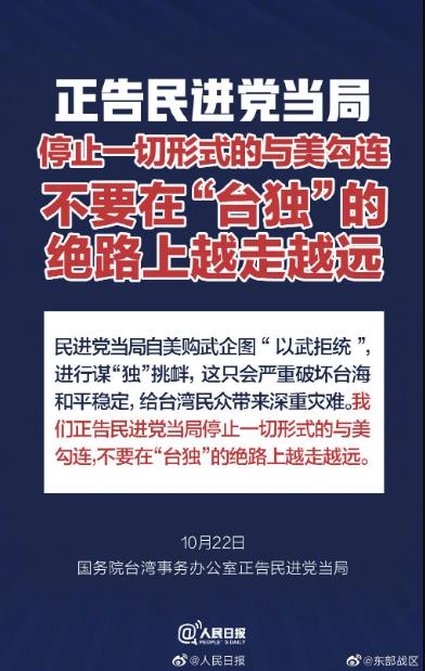 国台办向台湾民进党发出强烈警告:正告民进党当局,停止一切形式的与美勾连,不要在“台独”的绝路上越走越远。