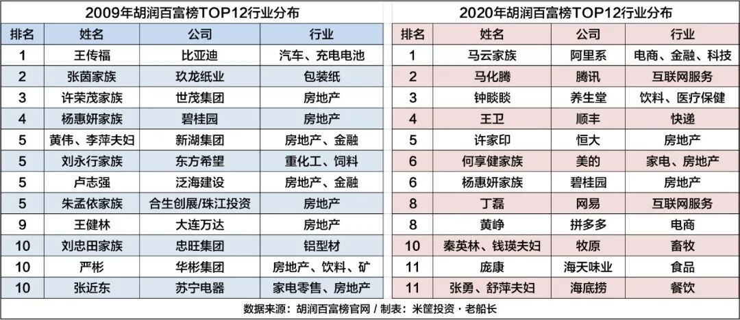 2009年时,富豪榜单前12大富豪,有8个都以房地产为主业或者参与房地产,而到了2020年,前12大富豪中,只剩下恒大的许家印、美的的何享健家族、碧桂园的杨惠妍家族经营房地产生意。