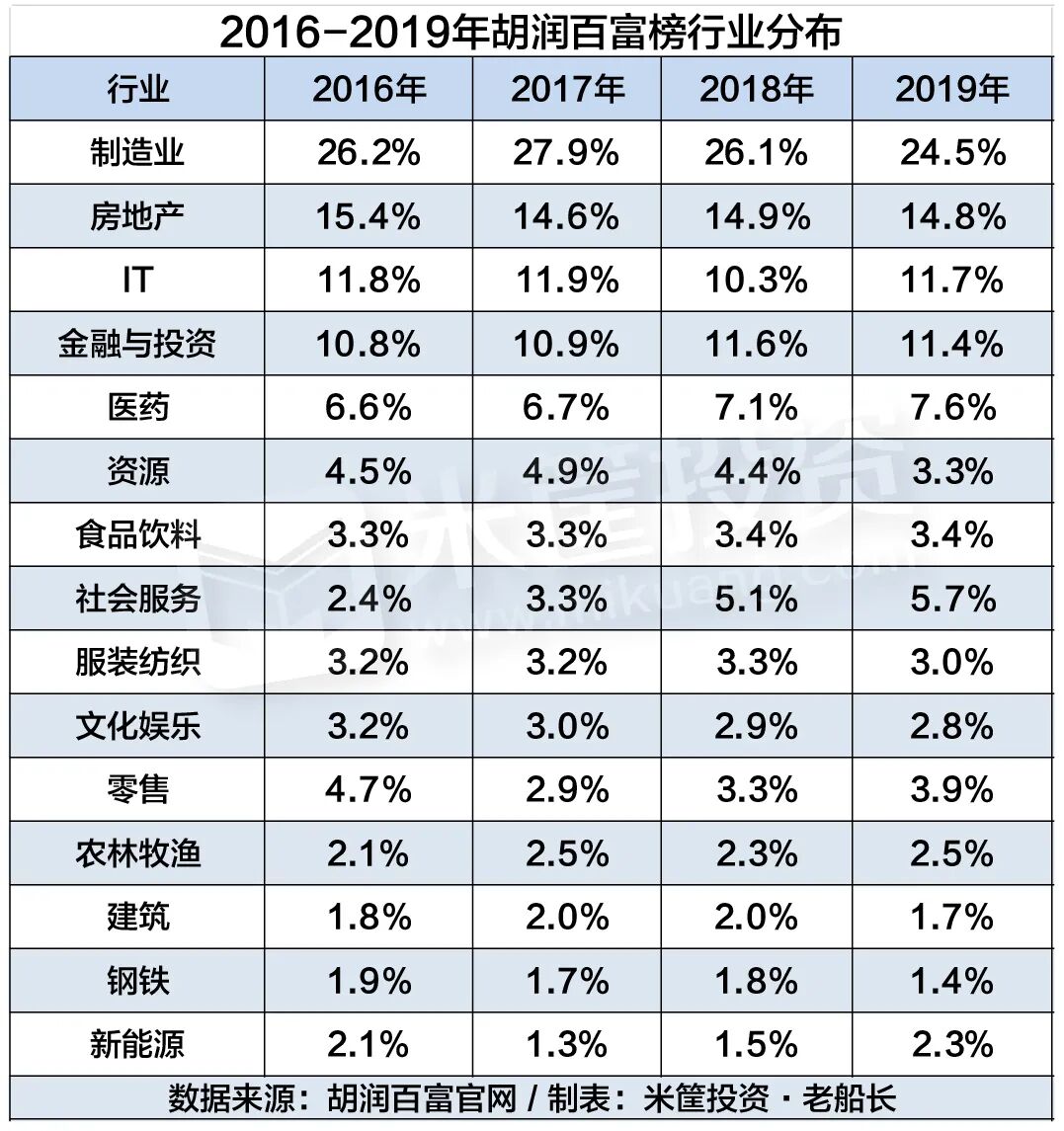 回顾过去的百富榜行业分布中,制造业一直都是制造富豪的霸主行业。但随着经济形势的转变,2016-2019年,制造业的占比已经在逐步下降。