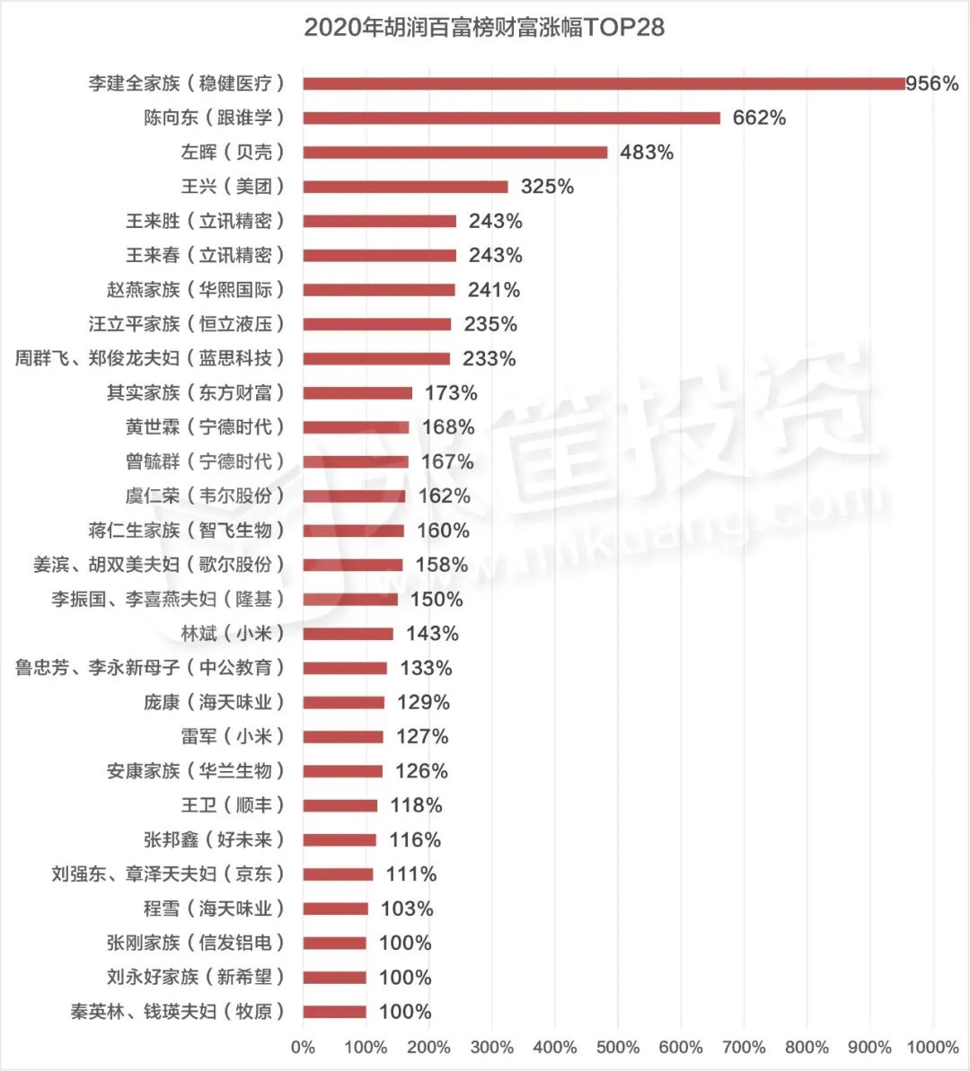 贝壳的左晖财富增长483%、美团的王兴财富增长325%,排在三四位。而后的立讯精密、华熙国际、宁德时代、小米、海天味业、牧原等财富翻倍的企业家,都是近两年炙手可热的企业。