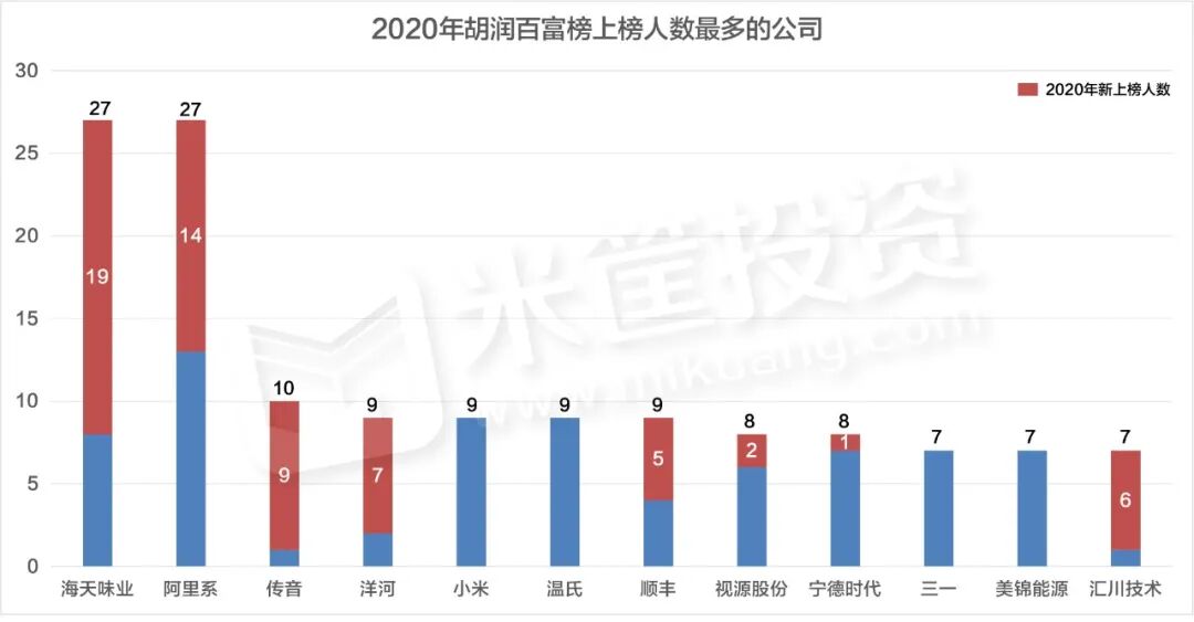 在今年上榜最多人数的公司中,位于佛山的海天味业贡献了19人、位于杭州的阿里贡献了14人、位于深圳的传音贡献了9人。