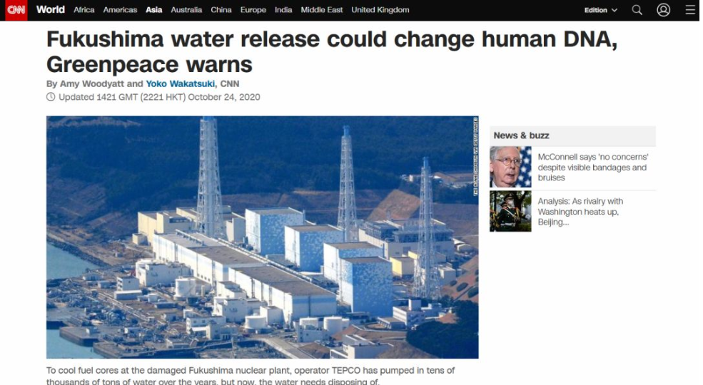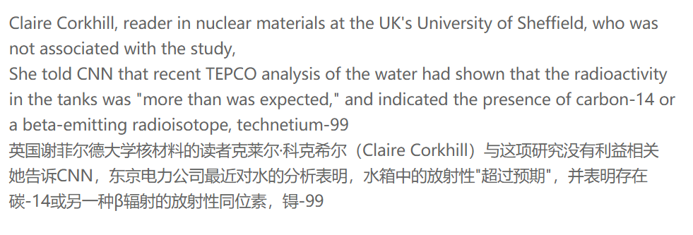 绿色和平最近一份报告称,日本核污水中含有放射性同位素氚和碳-14,其中,碳-14作为“人类集体辐射剂量的主要贡献者,有可能损害人类DNA。” 德国绿色和平组织高级核专家肖恩·伯尼(Shaun Burnie)称,存储水箱中总共可能有多达63.6GBq(千兆贝克勒尔)的碳-14。“这些及污水中的其他放射性核素,在数千年内都将是危险的,并有可能造成基因损害。这也是必须放弃这一计划(排放入海)的原因。”