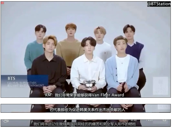 再到前不久韩国男团“防弹少年团”在得获范弗利特奖之后,(没错,这里的范弗利特,指的正是那个对志愿军阵地进行了猛烈的炮火轰炸,以范弗利特弹药量闻名于世的联合国军第八集团军司令范弗利特)公然发言铭记朝鲜战场韩美两国军人后,国内韩娱女孩毫无底线的辩白与跪舔....