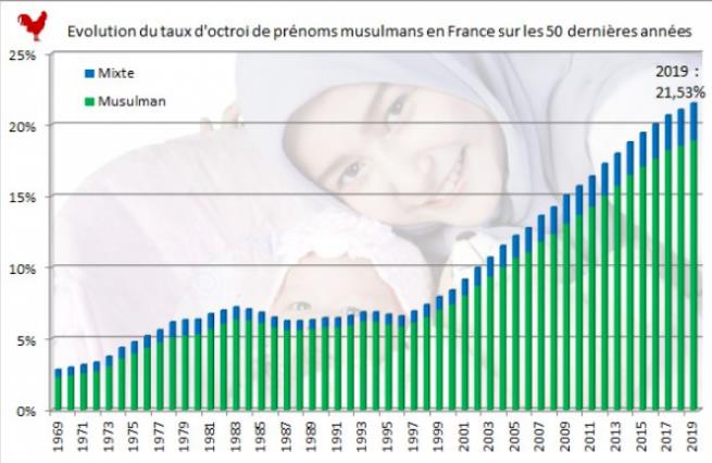 法国并没有官方的统计族裔出生率的机构,因此谁也不知道法国穆斯林出生率为多少,法国的Fdesouche搞了一次调查,通过统计“像穆斯林名字”的新生儿来预估法国穆斯林出生率。