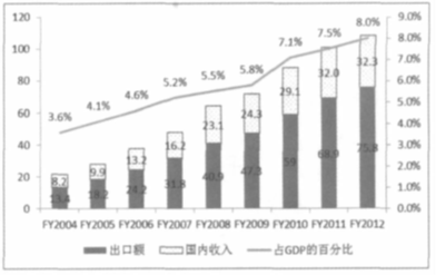 2011财年,印度信息技术和业务流程外包产业总收入达1009亿美元,其中出口额有689亿美元,出口规模占总产出的比例达68%,而国内规模仅有320亿美元,国内市场和国际市场发展失衡。