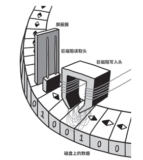 因此可以用微小磁性颗粒的磁场方向存储信息:用巨磁阻材料作为磁头,对应磁头上无电流和电流最大的两个磁场方向编码为0和1,这样就可以将大量比特存储在一张磁盘上,用巨磁阻磁头读写,这就是电脑硬盘的原理。