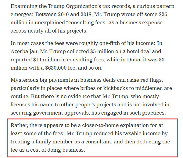 还有神秘的咨询费。据《纽约时报》报道,2010至2018年间,特朗普在其商业开支中有一大笔可疑的咨询费,帮他扣掉了2800万美元的税费。