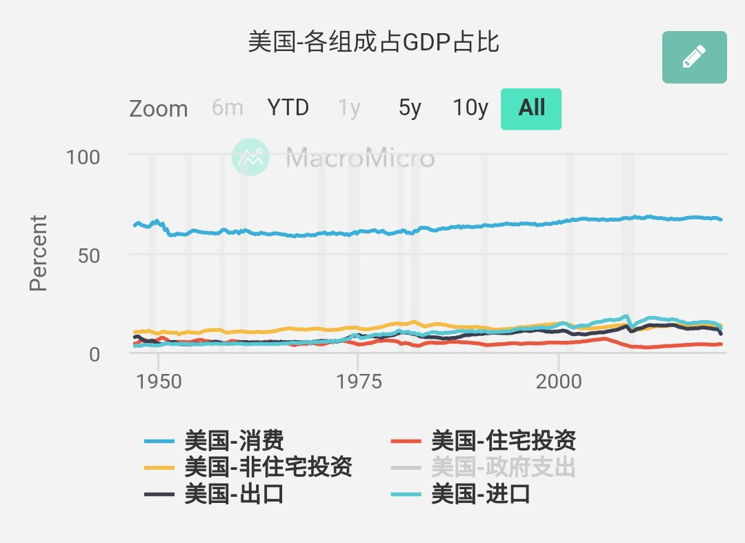 所以,美国的GDP增长,主要还是由消费拉动。事实也如此,消费占美国GDP的比重,接近七成。