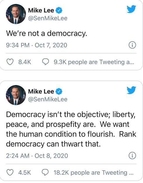 共和党政客对此越来越不掩饰。参议员Mike Lee干脆说,美国不是民主。
