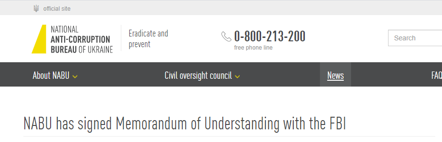 乌克兰反腐败局,简称NABU,其资金为欧盟和美国赞助,且和FBI有证据共享协议,这个协议是直接贴在NABU的官方网站上的: