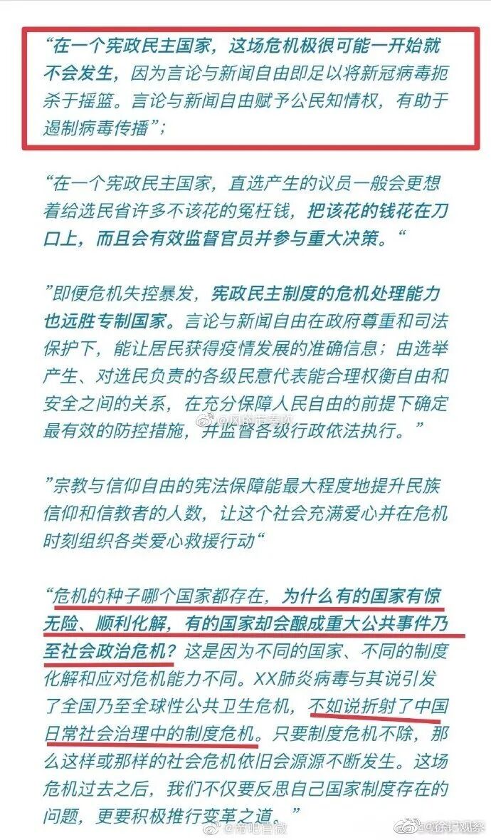今年一月下旬到二月初,新冠肺炎疫情在我国较为严重但国外暂时似乎还不怎么严重的时候,有些人觉得可逮到一个证明自己的学术能力的时候了。代表人物是北大的某个宪法学教授,写了一篇文章,论证中国的新冠肺炎疫情,是由于缺乏“宪政民主”所致。如果一个国家有了“宪政民主”,这疫情是不可能散播开的。