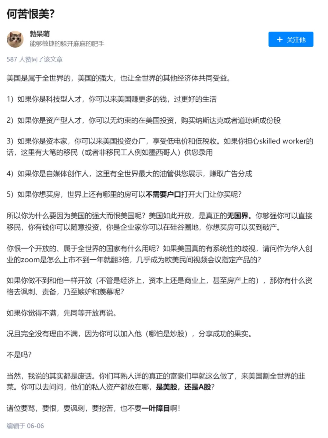 不同于北斗那批人,对美国的信仰是建立在整个由制度,经济理论,哲学观点等构建的世界观上,高华群体们对美国的热爱表现出一种庸俗实用主义,即有奶就是娘,谁有钱谁棒子粗就有道理,有钱棒子又粗就是他们热爱美国的最大理由。在国内工作创业不存在的,当个湾区码农年薪百万刀他不香吗?所以他们实际上并不管美国的底层逻辑如何,因为有钱,逻辑就是合理的,也没有理念之分,谁在白宫就支持谁,非常善于粉饰美国的各种问题。年初高华们言之凿凿美国绝对不可能发生疫情,后来就当无事发生。特朗普在台上他们能吹,回头拜登如果上台了他们也会继续吹下去。