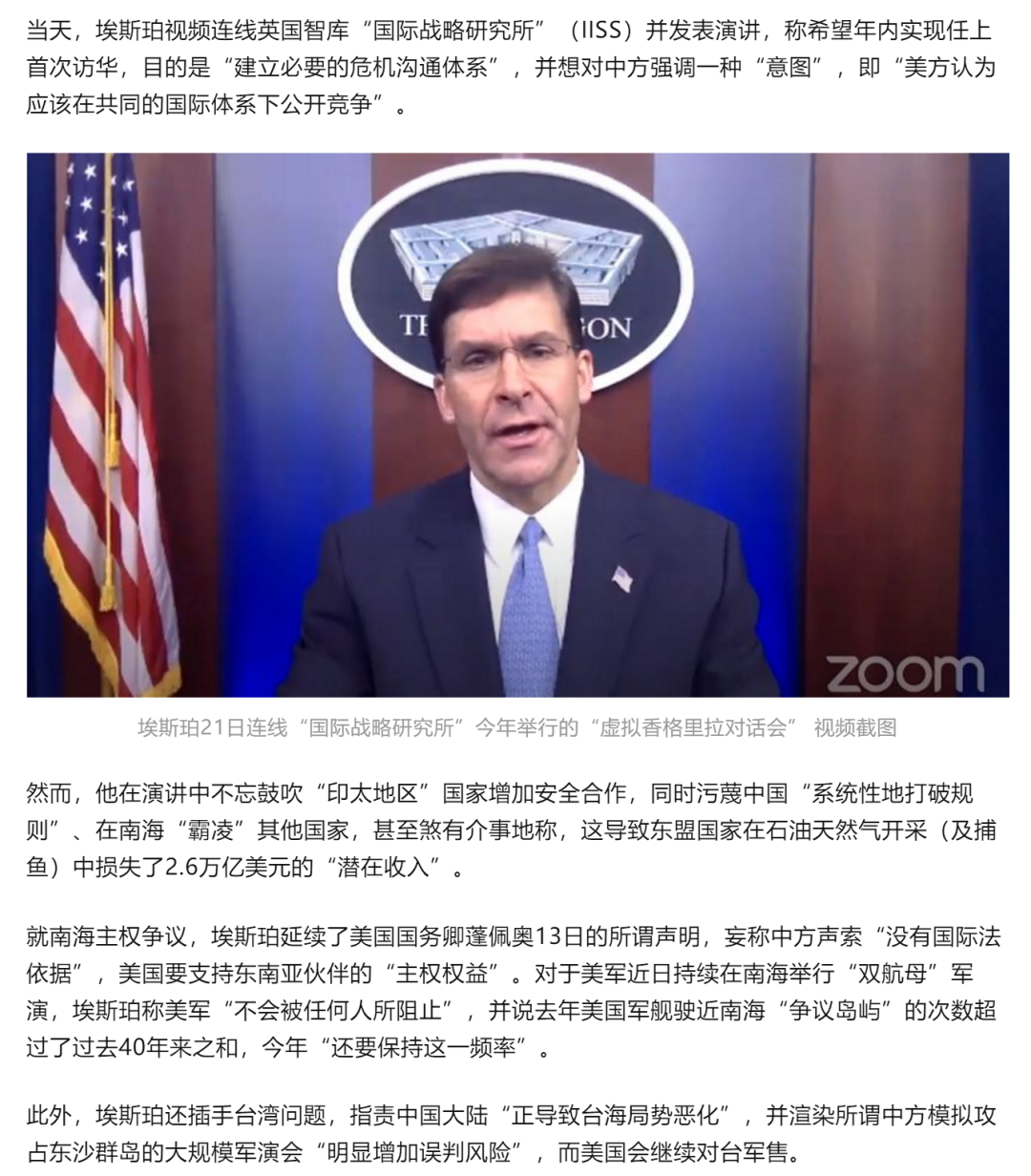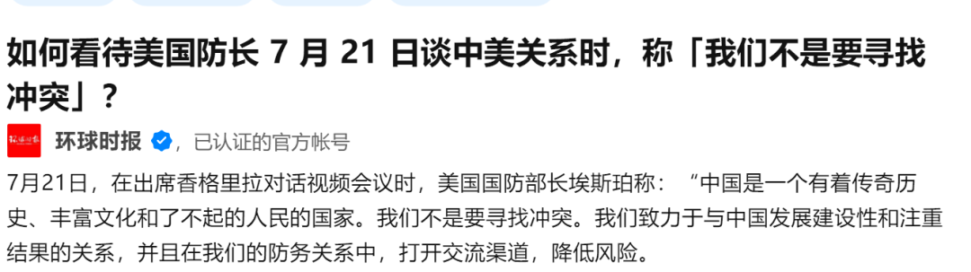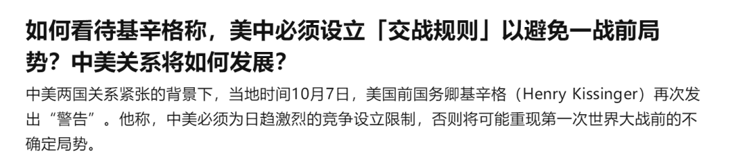 当然,高华们的斡旋只是供人消遣的行为艺术,我们来说点真正的斡旋。这几个月从美国防部长埃斯珀到中国人民的老朋友基辛格,美国政界那些现实主义精英们也在努力斡旋中美关系,防止中美间产生战略误判,造成如16年南海对峙那样的重大冲突。只是我们不难看出这种斡旋是很别扭的,一方面认为中美应该寻求共识,打开交流渠道,降低冲突风险,另一方面本质上还是美国优先,防止中国崛起威胁美国的霸权思维。
