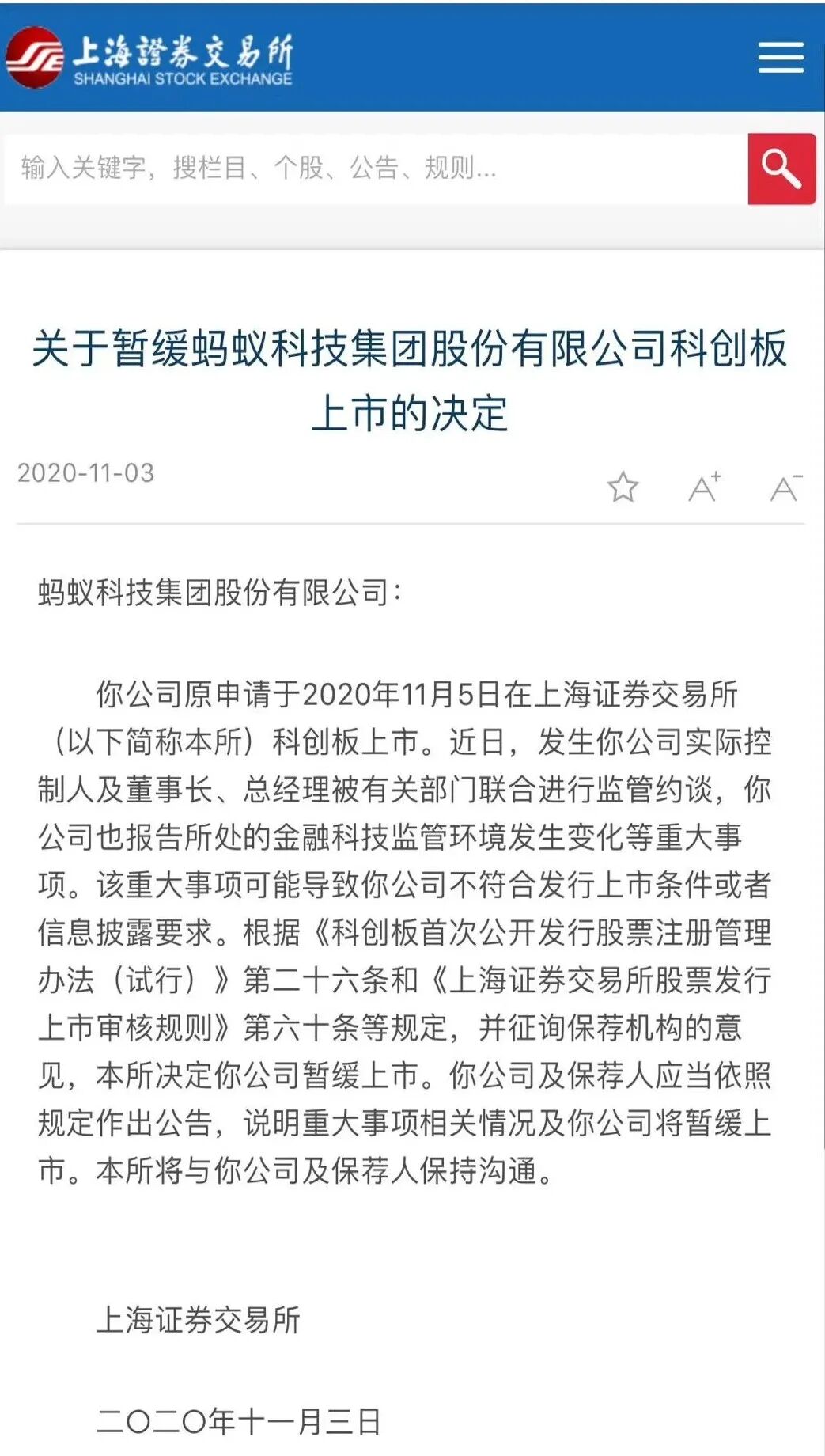 这次演讲引起巨大争议,不少金融界人士痛骂马云“傲慢无知”,部分网友则大呼过瘾,说马云“骂得好”。不过,事情远未终结:11月2日,中国人民银行、中国银保监会、中国证监会、国家外汇管理局对蚂蚁集团实际控制人马云、董事长井贤栋、总裁胡晓明进行了监管约谈。11月3日晚间,上海证券交易所发布消息称,暂缓蚂蚁科技集团科创板上市的决定。这次约谈在中国金融历史上有特别的意味,也是一道分水岭。从此,所谓的金融科技公司、普惠金融公司进入强监管模式,安全、稳定成为开展业务的前提,有望和银行享受一样的“待遇”。