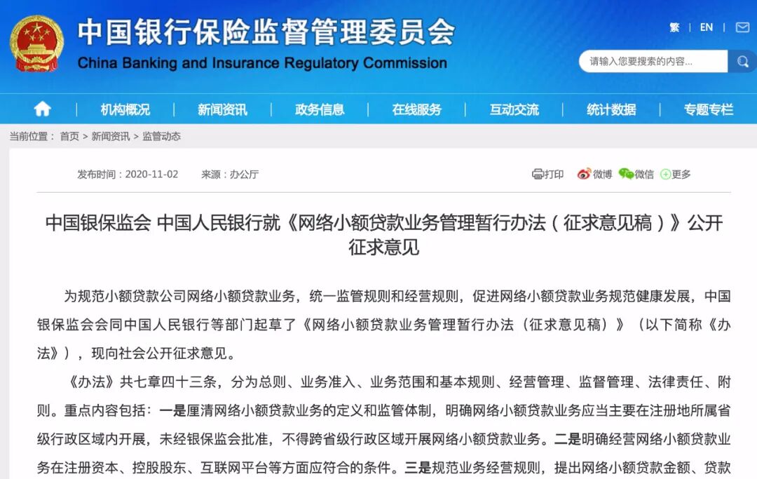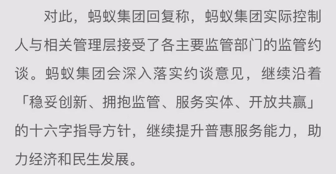▲助贷导流业务流程资产证券化还有一个路子就是需要提高资本金,这是巴塞尔协议的要求,但是蚂蚁哪来的这么大额度的自有资本?也就是说,蚂蚁未来继续业务大拓展的两条路都被堵死了,马云能不着急上火吗?开炮是必然的,不开炮的话,蚂蚁一上市就会面临业绩压力和成长空间的质疑;开炮的话,如果能轰开一个口子,还可以继续对资本市场讲故事,至少可以在自己和朋友们减持之前维持一个高股价。以马云的智慧应该已经有了开炮之后的各种“预案”,何况阿里的公关素有“天团”之称。第一种结局是最好的:马云讲话,引发监管松动,蚂蚁得到更多发展空间,继续玩目前的模式,甚至玩得更大,股东们发更大的财;第二种结局是中等的:各方对马云的发言一笑了之,这事儿也就过去了;第三种结局是最差的:引发监管收紧,蚂蚁面临业务压力,甚至对后续的股价会有影响。现在的事实是,“四部门约谈马云、井贤栋、胡晓明”很明显就是马云捅了马蜂窝,引发了整个监管体系的大反弹。日前,央行旗下金融时报刊发题目为《大型互联网企业进入金融领域的潜在风险与监管》的文章,作者为资深学者周矍铄,但是这个人在网上查不到任何公开信息,此前也没有什么知名度,这才是最诡异的,也是一种态度。11月2日,银保监会消费者权益保护局局长郭武平发表了一篇文章,他在文中说“对于金融科技公司的消费者权益保护,目前缺乏明确规则和要求,出现了监管套利行为,与持牌金融机构形成不当竞争,最终难以有效保障金融消费者权益”。这话基本就是打马老师的脸,一点不客气。更要命的是,媒体在11月3日纷纷推送新闻:网络小贷办法征求意见,花呗、借呗将迎监管“天花板”。网络小贷可是蚂蚁的重要收入来源,征求意见稿明确了准入条件、资金来源、杠杆率、两参一控,还有自然人单户不超30万的要求。对于马老师炮轰巴塞尔协议,前述“意见”直接就回应了:对助贷业务,要求互联网小贷机构出资30%,并提出诸多监管要求。马老师当时演讲感觉很爽,也引发了大批吃瓜群众的点赞,现在看来是个自己埋了雷,而且是一连串的雷。蚂蚁正在紧急补锅,既然已经被约谈了,那么一定要表态,这回不是蚂蚁金服,而是“马已经服”(我认为网上流传的“马已今服”在语意上并不通顺)。蚂蚁集团回复称,会深入落实约谈意见,继续沿着“稳妥创新、拥抱监管、服务实体、开放共赢”的十六字指导方针,继续提升普惠服务能力,助力经济和民生发展。在我看来,这十六字意味着蚂蚁的高速增长神话已经实质上终结,蚂蚁以后将享受银行级别的监管待遇,再无野蛮生长。在金融稳定的紧迫性面前,任何所谓“创新”、“普惠”、“科技”都要低头,或者扯下面纱,露出真面目。