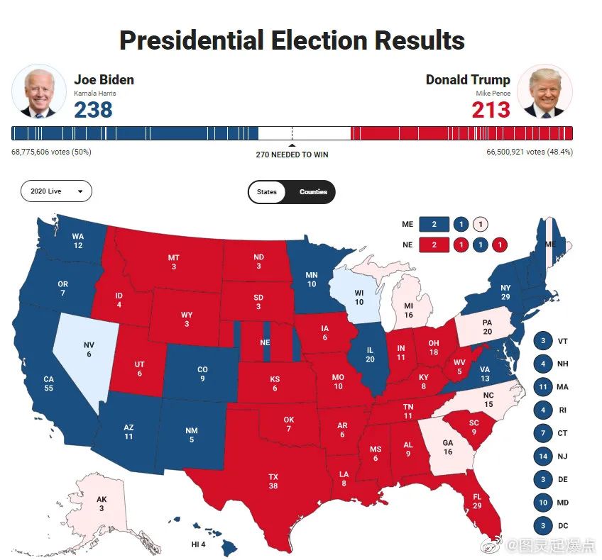 在没完全出结果的州中,截止到北京时间18:30分,还有4个州特朗普处于领先位置,而且特朗普领先的州选举人票更多,所以选情依然有较大悬念。缅因州并不使用“赢者通吃”的选举人团规则,现在拜登拿到了缅因州4张选举人票的3张,还有1张归属未定。