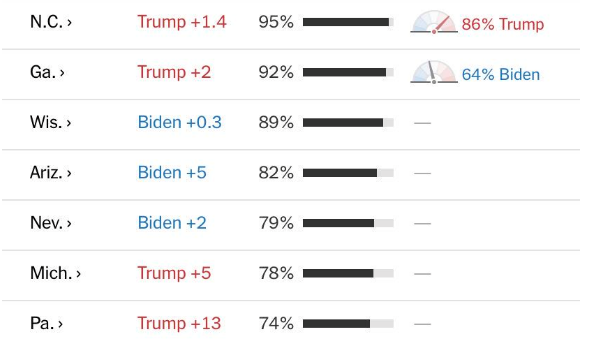 截止到北京时间11月4日16:00,特朗普虽然以213张选举人票落后于拜登的238张选举人票,但由于还有7个州和缅因州的部分选区没有最终统计出结果,而在这些州中特朗普暂时处于领先地位。