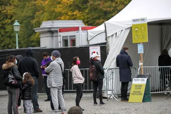 ▲10月17日,在比利时布鲁塞尔,人们排队等待做核酸检测。新华社