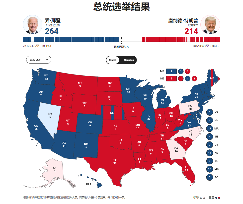 到目前为止,拜登已经获得超过7000万张选票、264张选举人票,创美国历史之最。川总做为美国现任总统,才获得6730万张选票、214张选举人票。