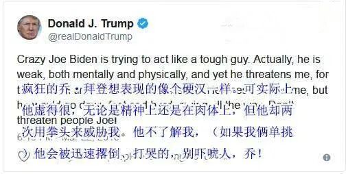 特朗普在推文中表示,拜登在身体和精神上都不是他的对手。如果单挑,他可以把拜登打哭。