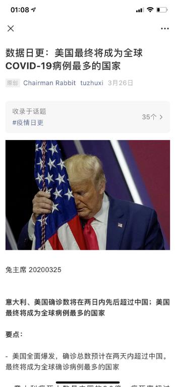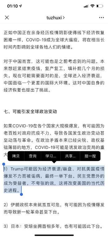 “如果COVID-19在各个国家大规模爆发,有可能因为老百姓对政府抗疫不力,导致各国发生政治变动甚至动荡与革命……Trump可能因为经济衰退/崩盘、对抗美国疫情爆发不力而被诟病,最终一举下台。民主党意外的成为受益者。不夸张的说,这将改变美国的当代历史进程。”