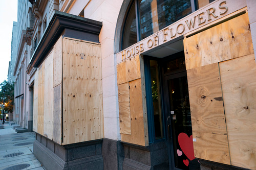 美国华盛顿,白宫附近的一家花店用木板加固了门窗。图源:新华社