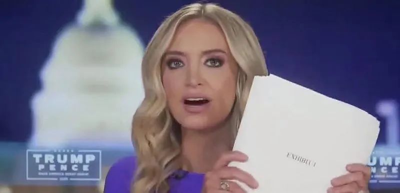 白宫新闻发言人凯利·麦肯内妮在一档新闻节目中展示长达234页的书面证词,指责本次大选存在选举舞弊现象。图源:美媒