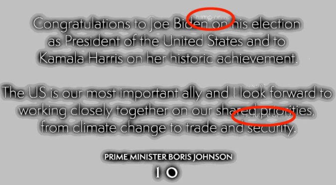 在英国首相约翰逊的贺电中,在拜登的名字上却依稀出现“特朗普”的名字,甚至还有“连任”字样。从约翰逊一开始发布的图片中可以看见,在拜登的名字右上方,隐约出现浅灰色的“Trump on(特朗普胜选)”字样