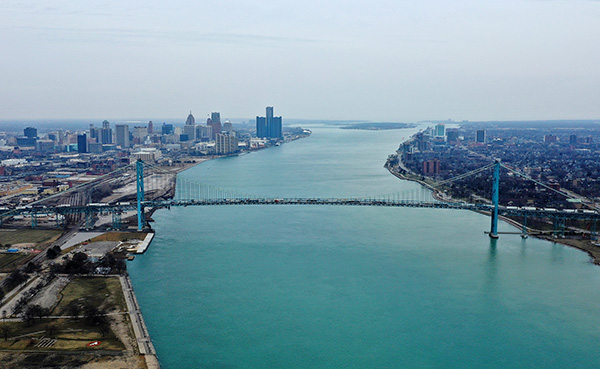 美国底特律和加拿大温莎的美加边境隔河相望。图|视觉中国