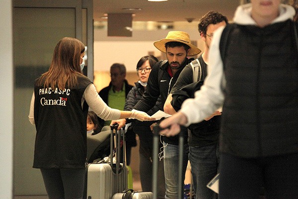 2020年3月18日,加拿大多伦多皮尔逊国际机场,加拿大公共卫生署工作人员向入境旅客派发防范新冠肺炎的宣传单。图|人民视觉