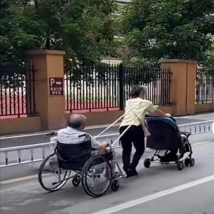 右肩上一根粗粗的绳子,将她和身后老人的轮椅紧紧地系在一起。
