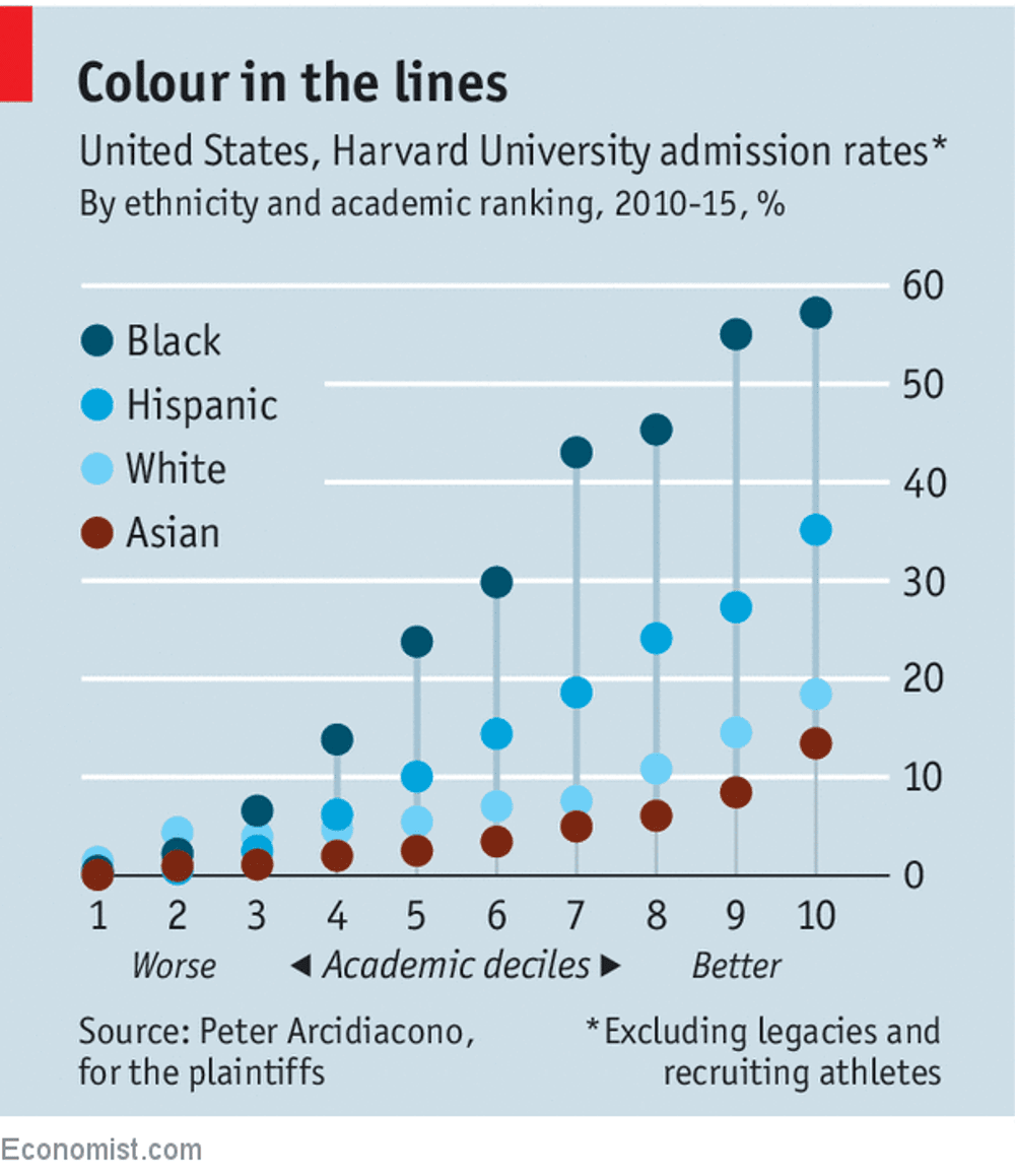 上图是杜克大学经济学家Peter Arcidiacono的统计:不同成绩档位学生被哈佛大学录取的可能性。最右边是成绩最好的10%学生,录取率为13.4%;白人为18.5%,黑人接近60%。Arcidiacono根据自己的统计模型估计,一个中产阶级出身男性亚裔学生申请哈佛大学,假设条件不错,有25%的录取率,仅仅把族裔一项换成白人,录取概率会提升到36%;如果变成拉丁裔,录取率会提升到77%,如果是黑人,则录取率会高达95%。