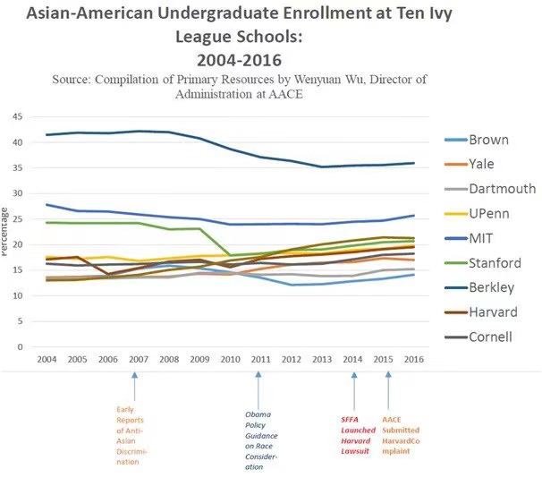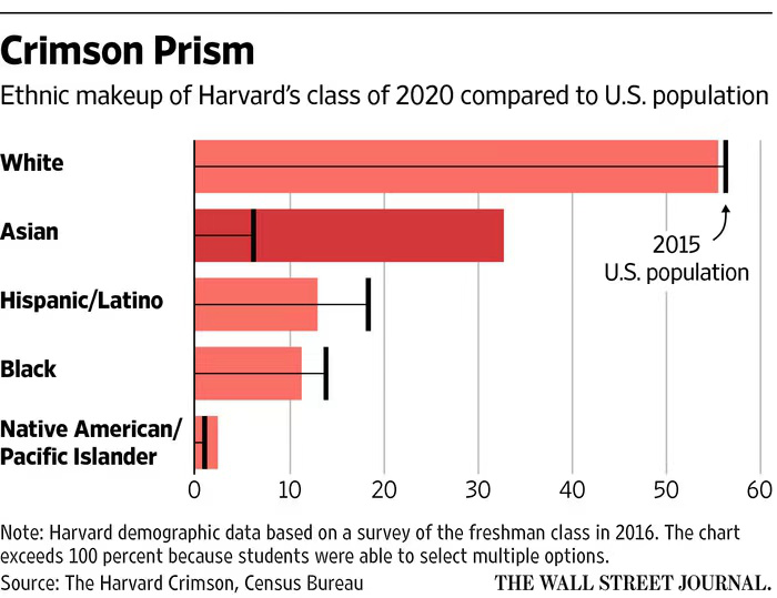 哈佛又是其中最受关注的。哈佛虽然是私立学校,但也接受联邦政府的资金,使其需要受到1964年民权法案的约束,不得基于种族歧视学生。但在招生里,学校是可以通过以各种变相理由把种族因素纳入的——譬如人格/性格、文化、对校园的“多元化”的贡献等。人们普遍认为,哈佛将亚裔学生的比率控制在20~30%左右(亚裔占美国人口5~6%)。
