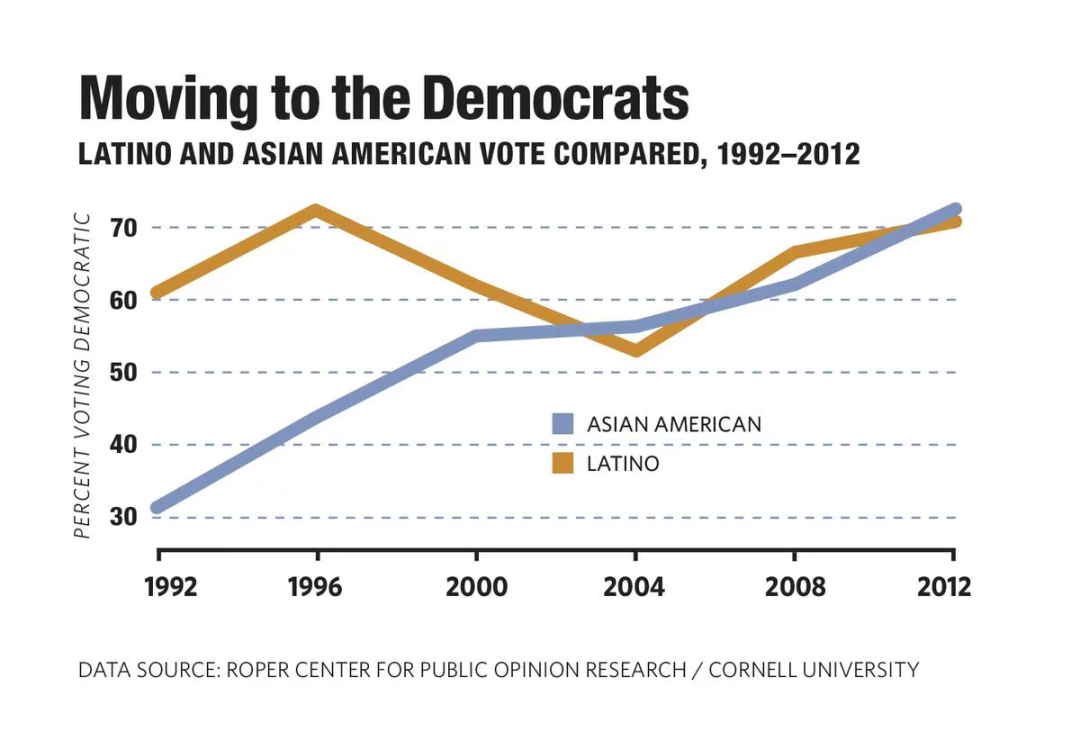 民主党是一个关注少数族群利益的党,过去几十年,亚裔美国人(Asian Americans)转变为大多数支持民主党,和美国其他少数族裔差不多。