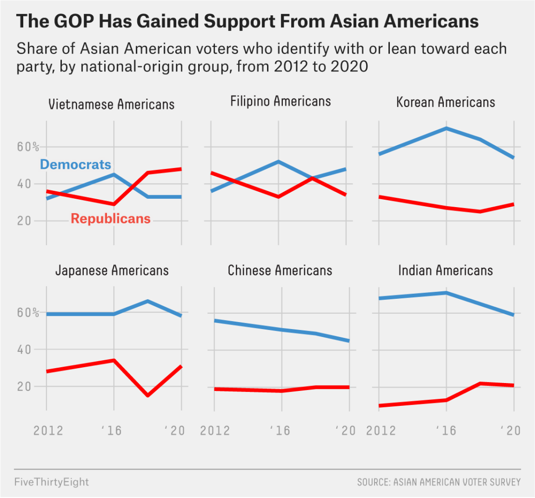上图可以看出,这几年,美籍华人对民主党(蓝色)的支持率有所下降,但共和党的支持率并没有什么变化,支持民主党的美籍华人仍然是支持共和党的两倍。